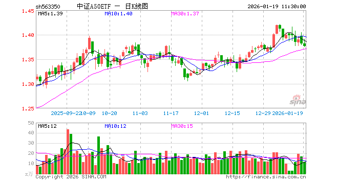 1月19日,截止午间收盘,中证A50ETF(563350)跌0.36%,报1.377元,成交额1601.19万元。中证A50ETF(563350)重仓股方面,宁德时代截止午盘跌1.42%,贵州茅台跌0.28%,中国平安跌0.56%,招商银行跌0.21%,紫金矿业跌0.88%,美的集团涨0.06%,长江电力涨0.83%,立讯精密涨0.52%,恒瑞医药跌1.03%,比亚迪涨0.13%。